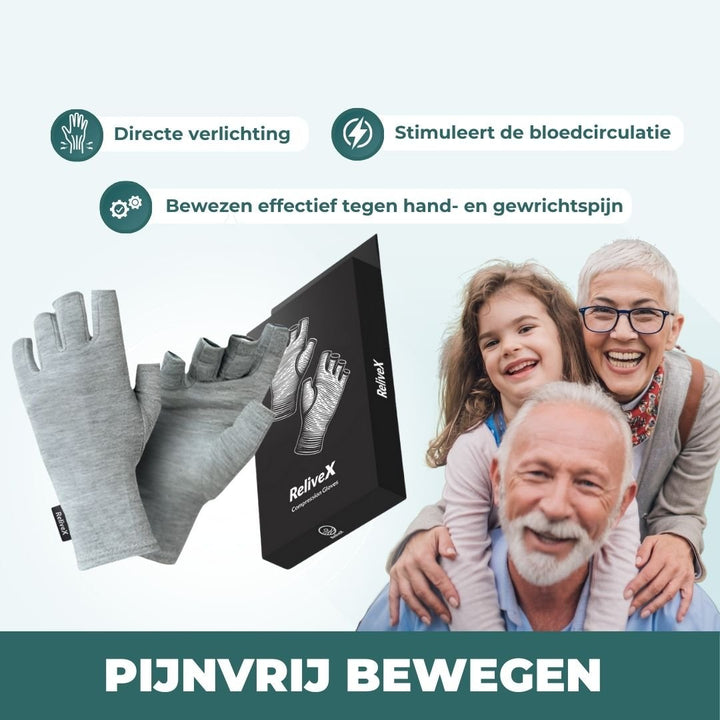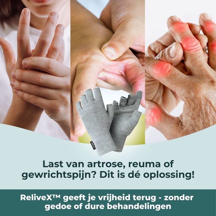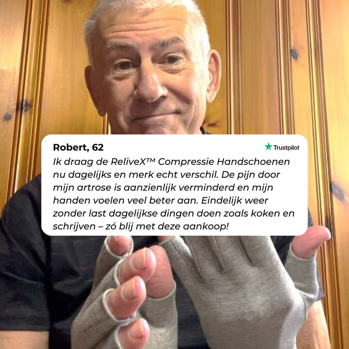Artrose, reuma of handpijn maakt bewegen lastig. De ReliveX™ Compressie Handschoenen bieden directe verlichting door gerichte compressie en betere doorbloeding. Ideaal voor dagelijks gebruik – zodat je weer soepel en pijnvrij kunt bewegen.