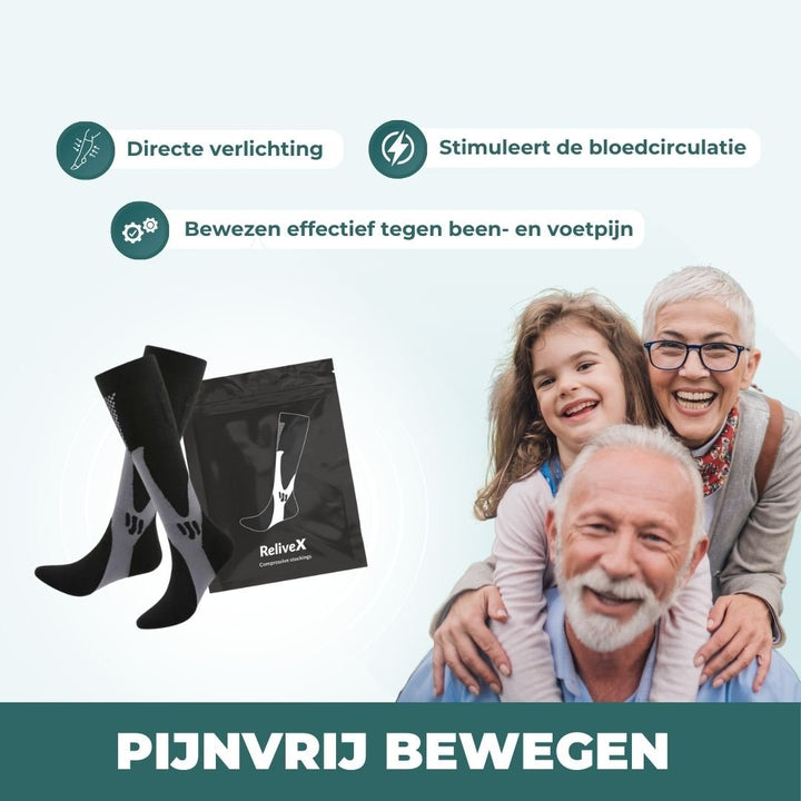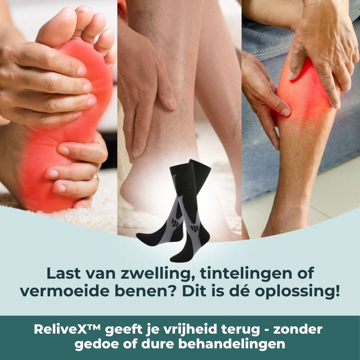 Heb je last van vermoeide benen, zwelling of pijn in je voeten? Ontdek onze nieuwe ReliveX Compressiesokken! Deze sokken stimuleren de bloedsomloop, verminderen zwelling en verlichten direct pijnlijke voeten en benen. Perfect voor dagelijks gebruik – of je nu lang staat, veel zit of gewoon extra comfort nodig hebt.