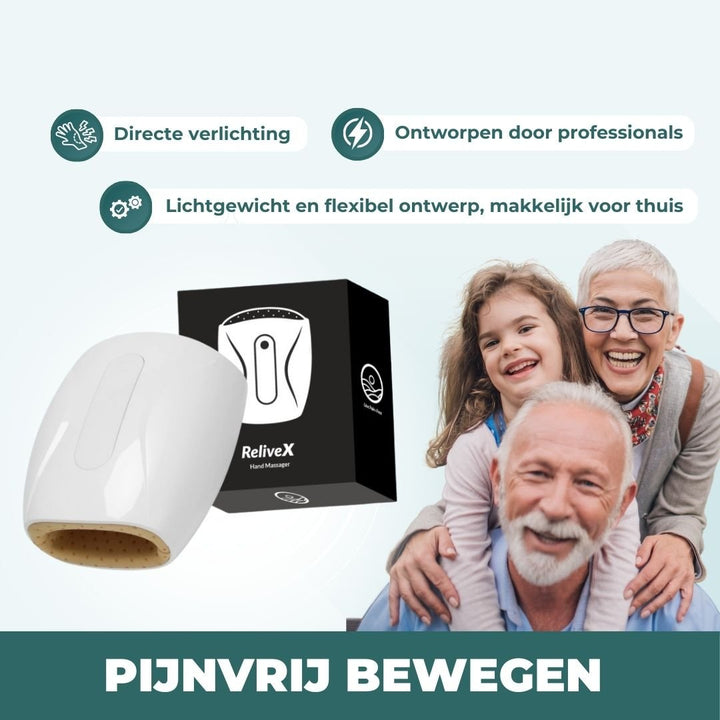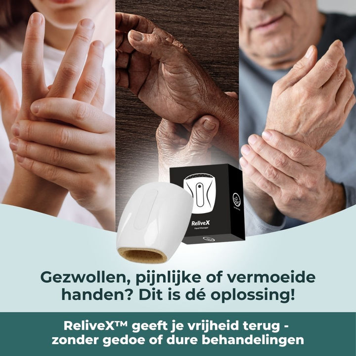 Ben je het zat om last te hebben van pijnlijke, stijve en bonzende handen? De ReliveX™ Handmassager combineert warmte- en compressietechnologie om de doorbloeding te verbeteren, gespannen spieren te ontspannen en pijn op een natuurlijke manier te verlichten.