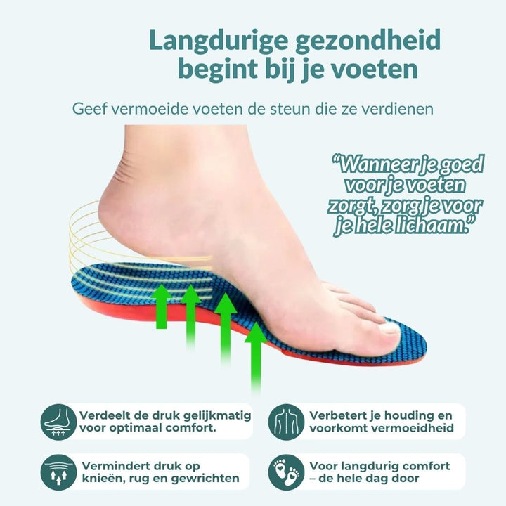 Onze Demping & Steun Inlegzolen verlichten hielpijn, stekende pijn en gezwollen voeten. Ze verbeteren de voetstand en bieden optimale steun en demping om druk op de hielen te verminderen en dagelijks comfort te verhogen.