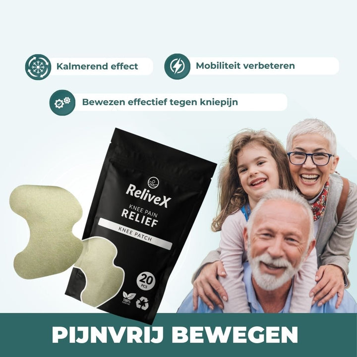 Heb je last van kniepijn, stijfheid of beperkte mobiliteit? Probeer onze nieuwe ReliveX™ Knie Pleisters! Ze werken snel, dringen diep door tot in het kniegewricht met natuurlijke ingrediënten, en zorgen voor een kalmerend effect dat pijn verlicht en de beweeglijkheid herstelt. Ervaar directe ontspanning en voel je knieën soepeler en sterker!