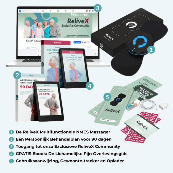 Directe verlichting bij (chronische) rugpijn, hernia, zenuwpijn of stijve schouders – zonder medicijnen of fysio. De ReliveX Massager ontspant je spieren diep met NMES-technologie – gewoon thuis, in 15 minuten per dag.